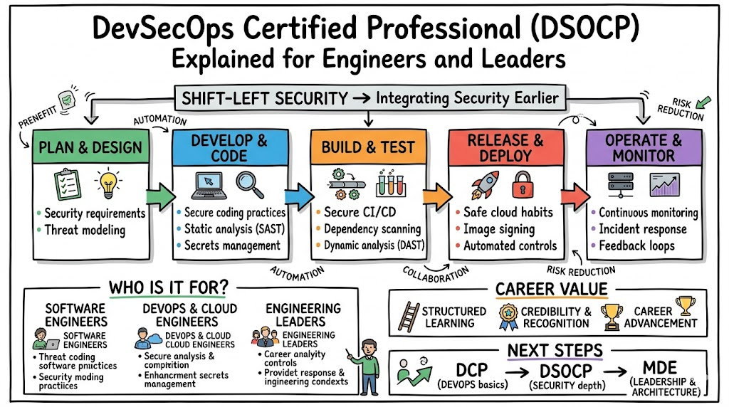 In simple words, DSOCP teaches professionals how to make software delivery secure from the beginning instead of trying to fix security at the end. That includes thinking about secure CI/CD, safer cloud practices, release discipline, secrets awareness, risk control, and better collaboration between engineering and security teams.