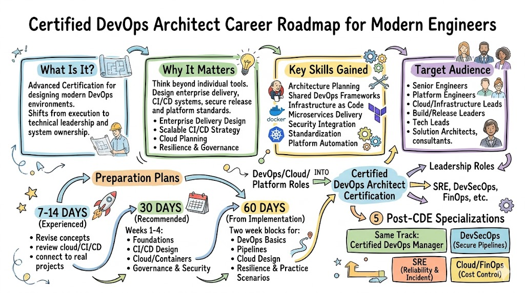 Certified DevOps Architect is a strong career choice for professionals who want to move from execution into system-level technical design. It combines automation, delivery planning, CI/CD architecture, cloud thinking, governance, security, resilience, and scalability into one advanced learning path. For engineers, it develops wider technical vision. For managers, it improves understanding of how delivery platforms should be designed. For senior professionals, it strengthens credibility for architecture and leadership positions. If your goal is to create better engineering systems, guide teams with stronger standards, and grow into higher technical ownership, this certification can be a smart and practical next step.