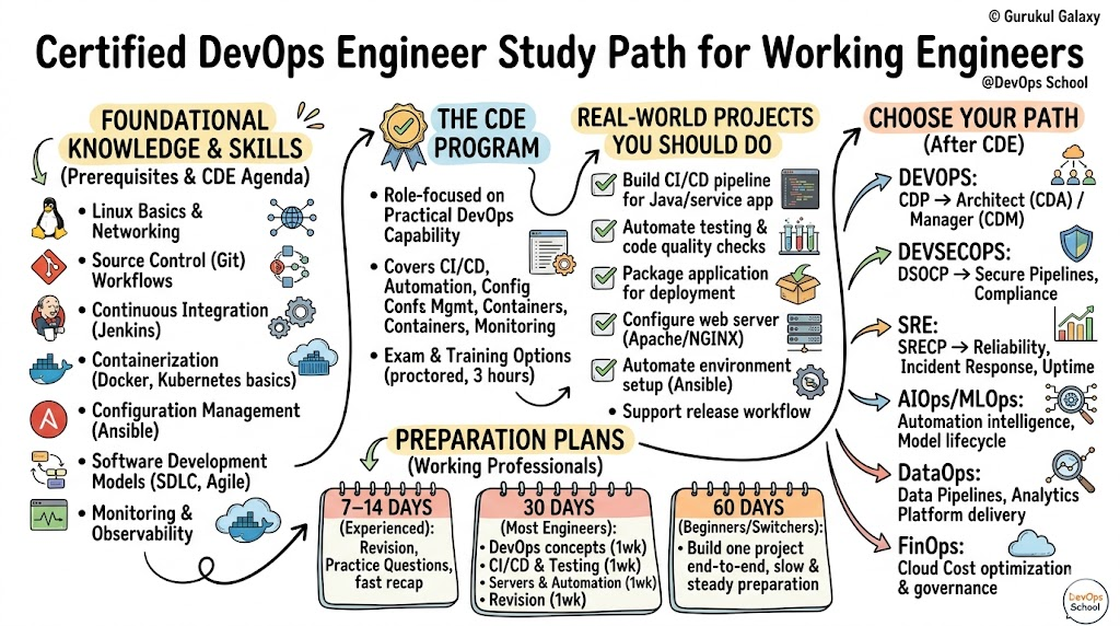 This path is ideal for professionals who want to become strong in delivery automation, release systems, cloud workflows, platform design, and engineering enablement. Begin with DevOps basics, move into hands-on implementation, then grow into professional-level learning, and finally step into architecture through Certified DevOps Architect.